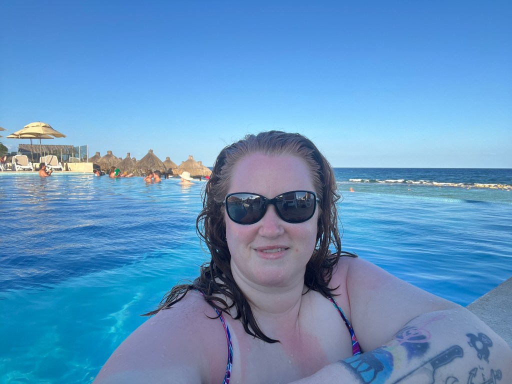 After the dolphin encounter we got into the manatee pool and got to feed a lovely, gentle manatee named Dorothea! When you are feeding them, I didn’t know they come up to you and hold you with their fins, so I was caught a little off guard. But it was oddly comforting! They feel so rough and are covered in green algae, which acts like sunscreen for them! From petting them, I found out their arm pit area is really soft!