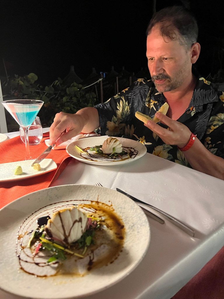 Later that evening, we had a romantic dinner on the beach. It was incredibly windy! But at least the wind was warm. We spent a lot of time and effort trying to keep the table cloth from flying up and into our meals. The food was amazing! But the highlight of the meal for me was the dessert! It was a beautiful heart shaped mousse with fruit and cocoa filling.