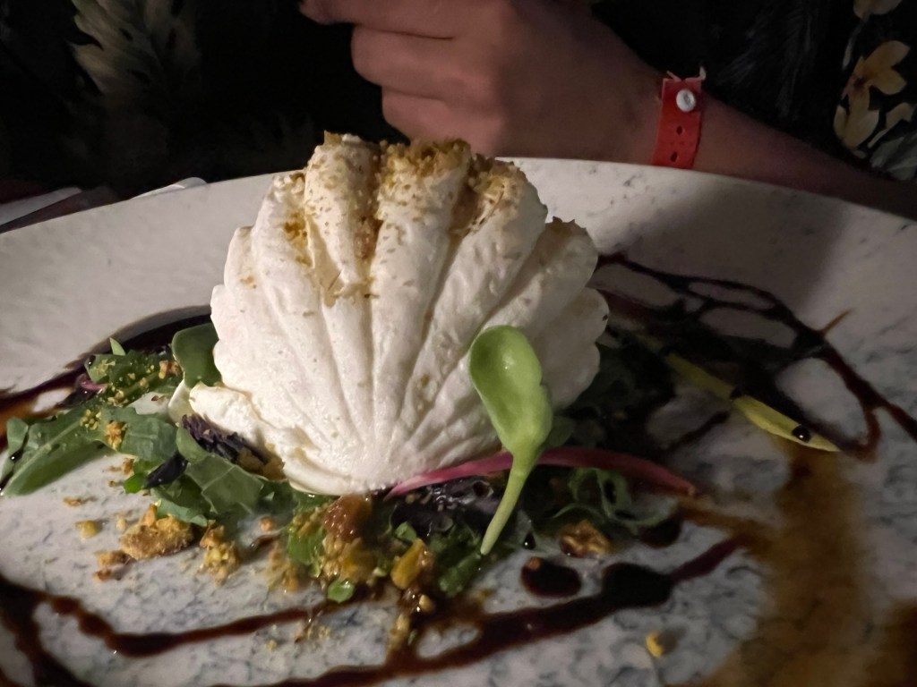 The appetizer was a goat cheese “salad”. I found it to have just too much cheese and not enough salad. But-look at the detail! The presentation of the cheese in a shell shape was clever, especially since the name of the restaurant is Fruits del Mar!