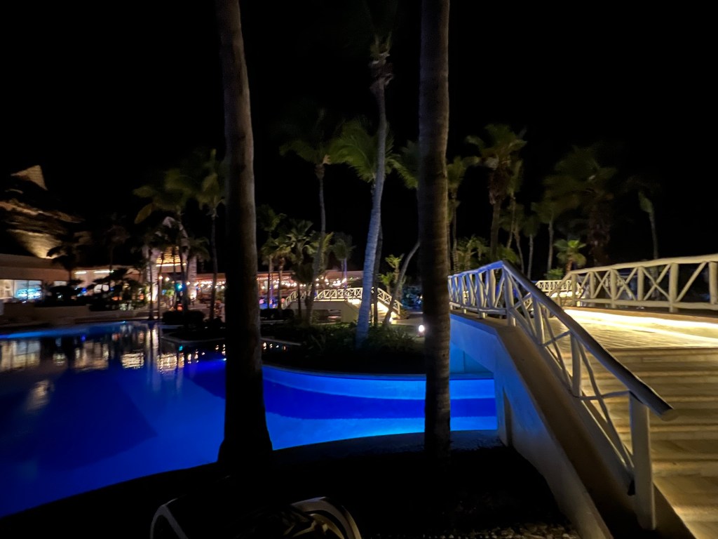 After we ate, we walked back to the main lobby of the resort. It looks so beautiful at night, with the lighting in the pools, and under the bridges.